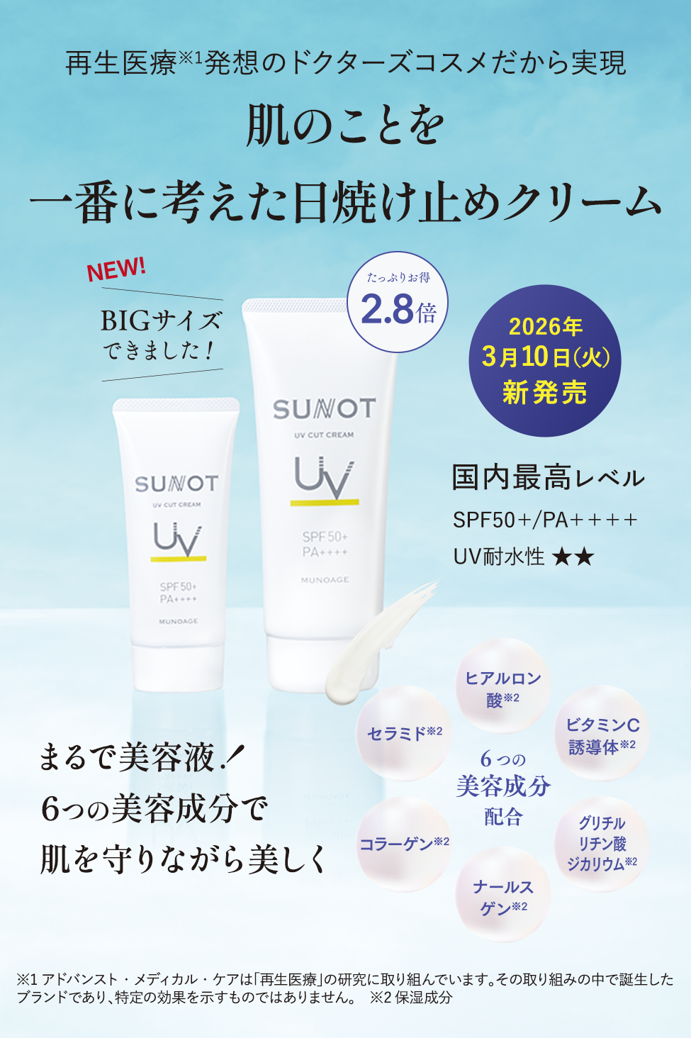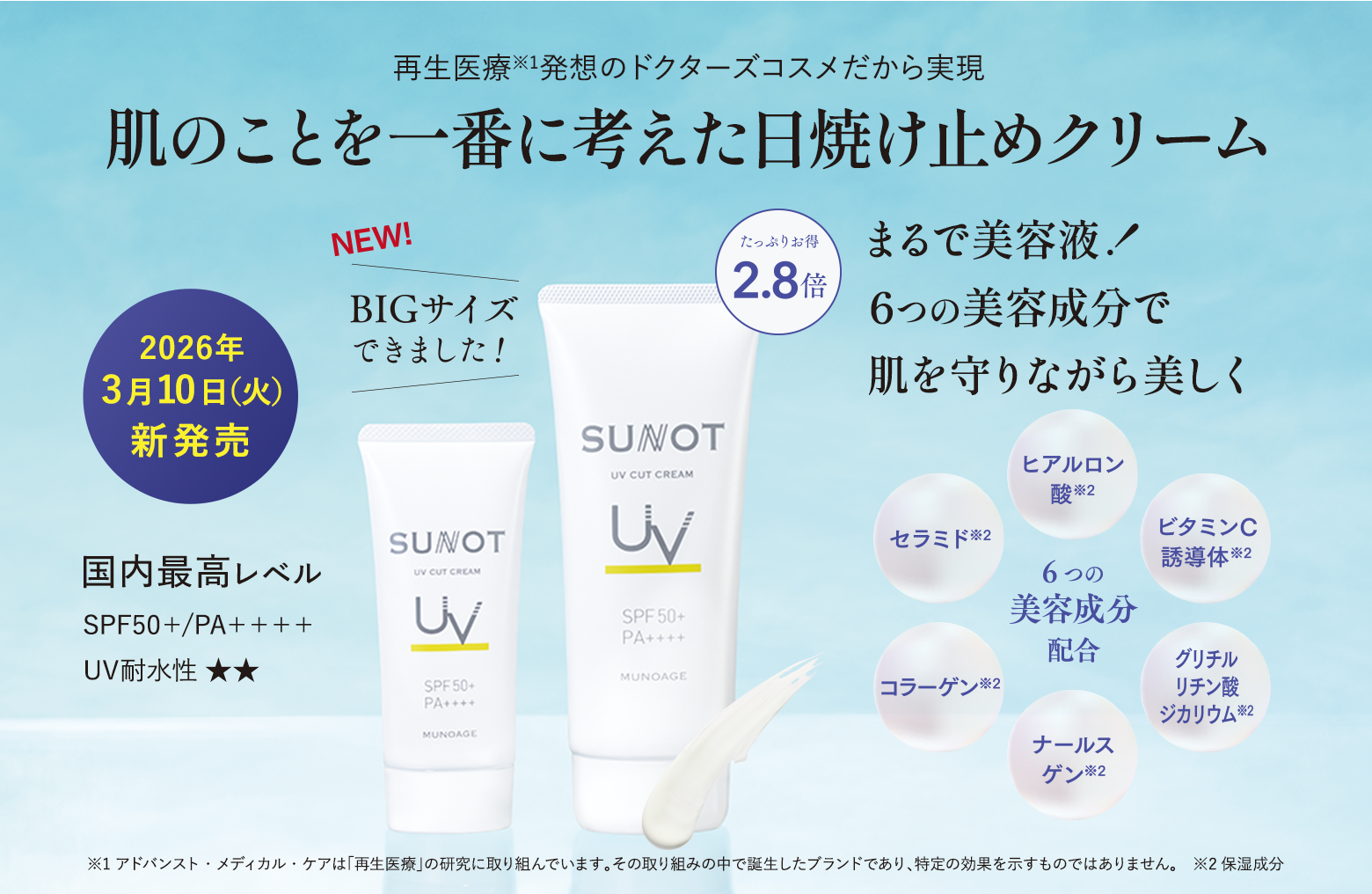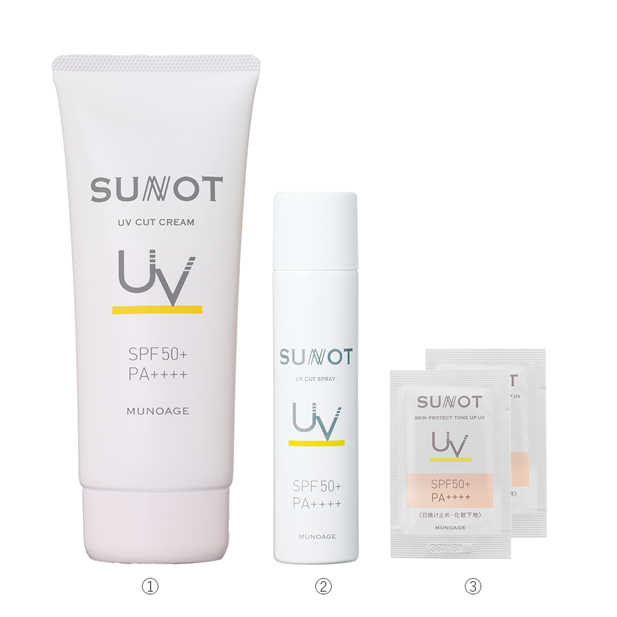 <セット内容> ①サンノット UVカットクリーム(BIGサイズ)140g ②サンノット UVカットスプレー 50g ③サンノット スキンプロテクトトーンアップUV サンプル 1g×2包